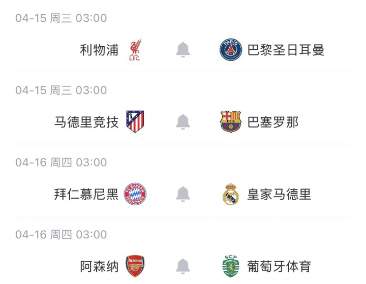 次回合将于4月15/16日进行,利物浦、马竞、拜仁和阿森纳主场作战。