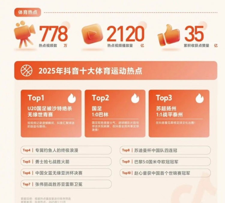 1月16日讯 日前,2025年抖音十大体育运动热点出炉。